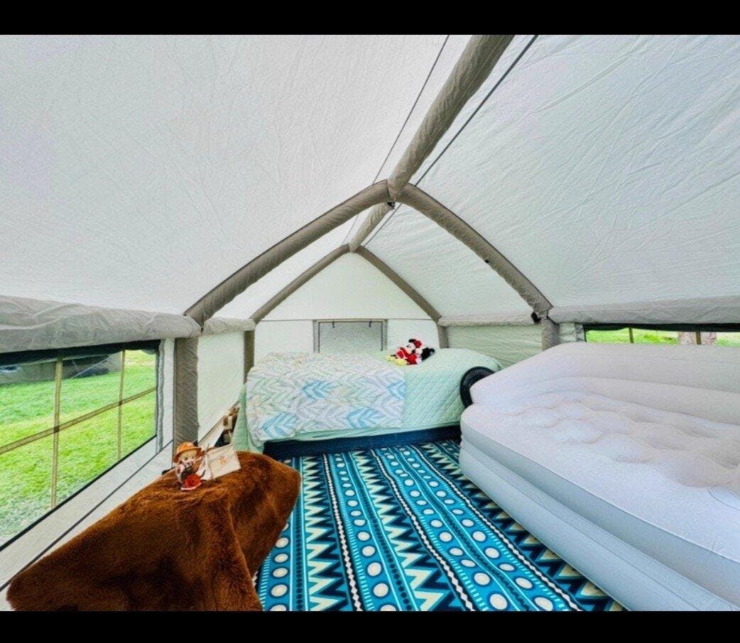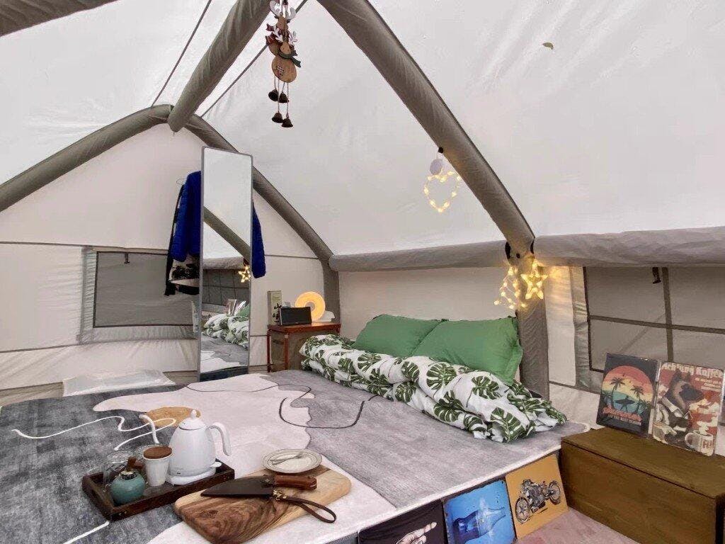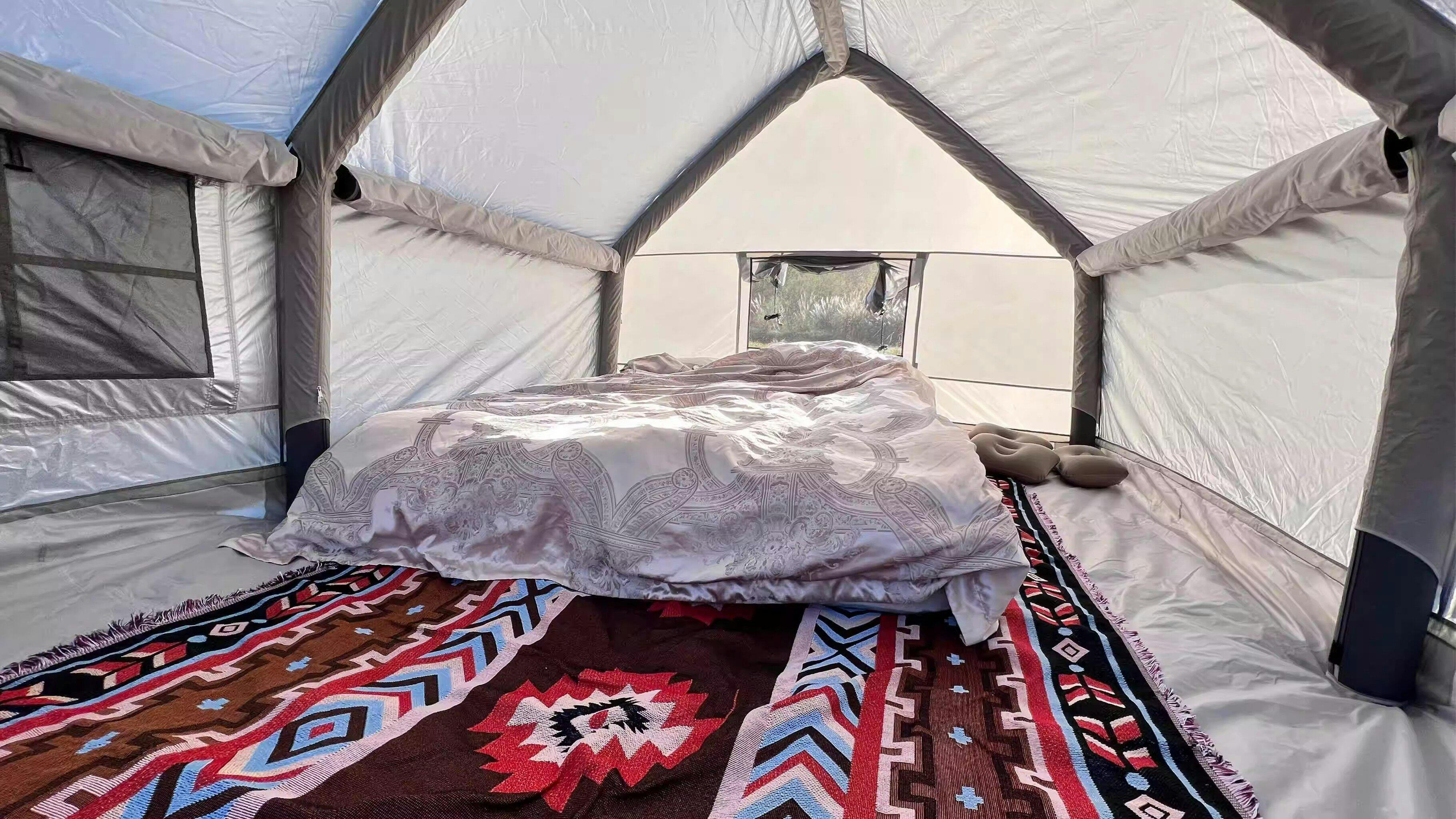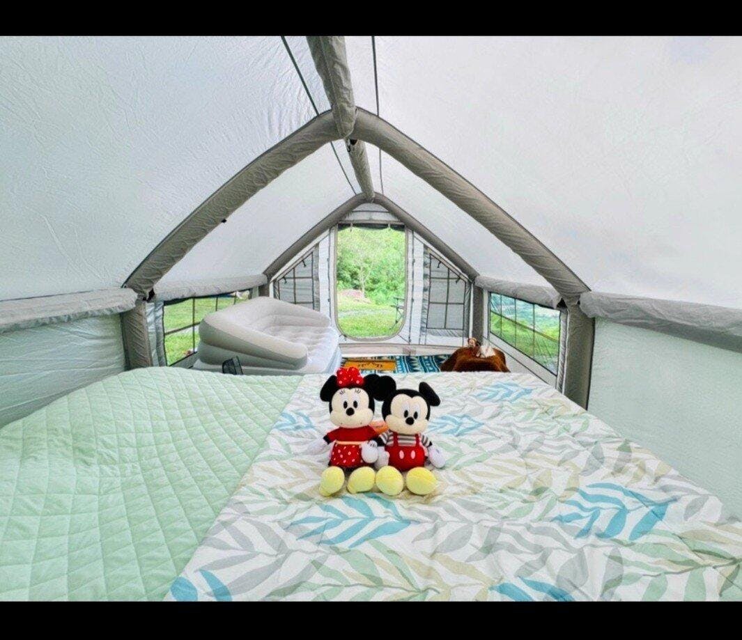 Found a treasure with this inflatable tent—stunning looks, reliable quality, and super easy to set up and pack away. Using a pump takes about 3-5 minutes to inflate, or you can use an electric air pump. Easy to install, easy to store, instantly gives you a spacious one-bedroom apartment feel with a divider curtain in the middle. Even after placing a double inflatable bed inside, there's still plenty of room to move around. The best part? No bending over to enter or exit. It never feels stuffy inside—opening the windows on all sides keeps it well-ventilated. I added some night scene mood lights, making evenings super cozy. I reached out to customer service several times with questions, and they were incredibly helpful. During my first camping trip, a strong wind blew through at night, but the tent stayed rock-solid with no leaks. Just goes to show I picked the right tent—hahaha!