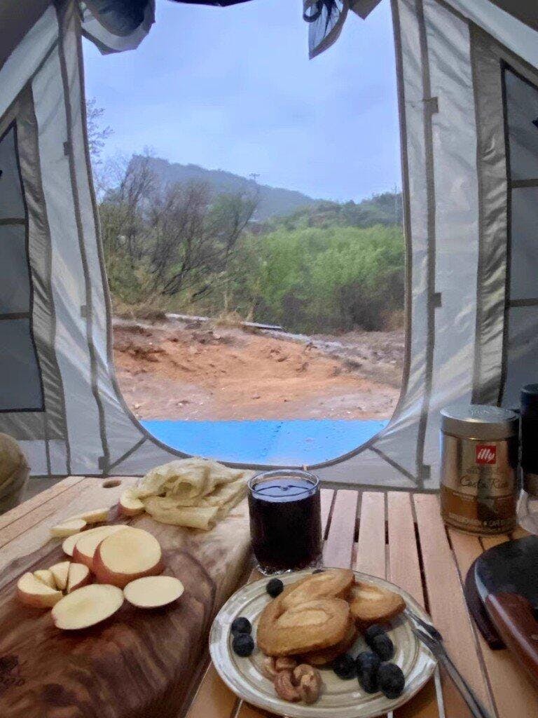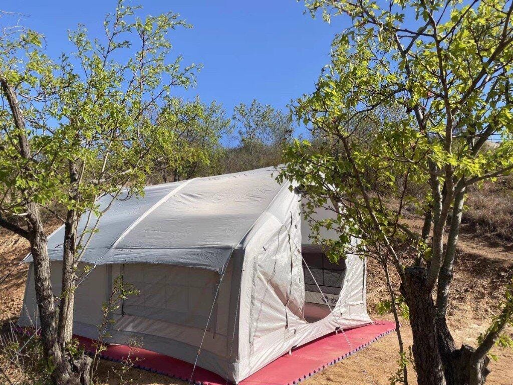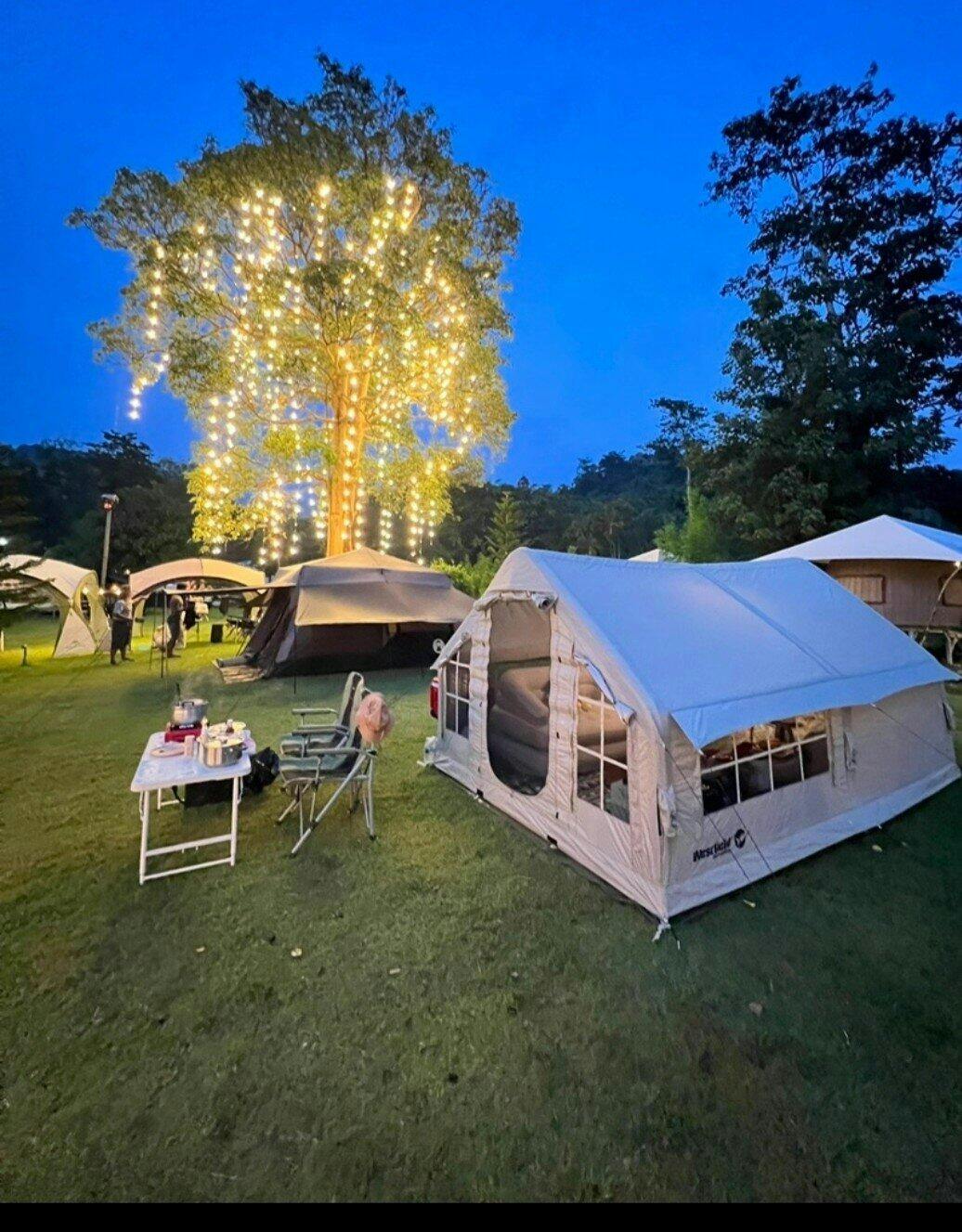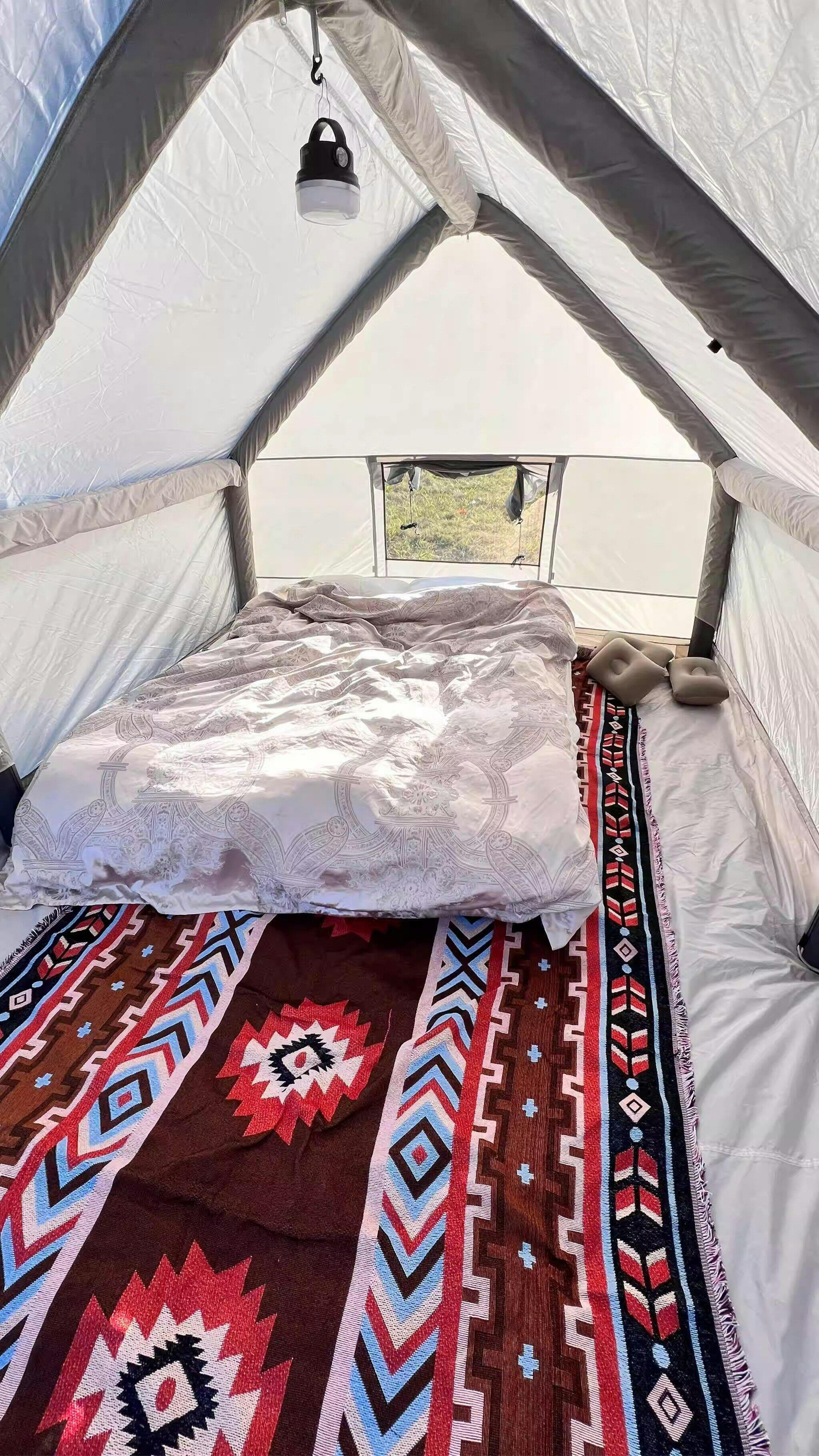 Found a treasure with this inflatable tent—stunning looks, reliable quality, and super easy to set up and pack away. Using a pump takes about 3-5 minutes to inflate, or you can use an electric air pump. Easy to install, easy to store, instantly gives you a spacious one-bedroom apartment feel with a divider curtain in the middle. Even after placing a double inflatable bed inside, there's still plenty of room to move around. The best part? No bending over to enter or exit. It never feels stuffy inside—opening the windows on all sides keeps it well-ventilated. I added some night scene mood lights, making evenings super cozy. I reached out to customer service several times with questions, and they were incredibly helpful. During my first camping trip, a strong wind blew through at night, but the tent stayed rock-solid with no leaks. Just goes to show I picked the right tent—hahaha!