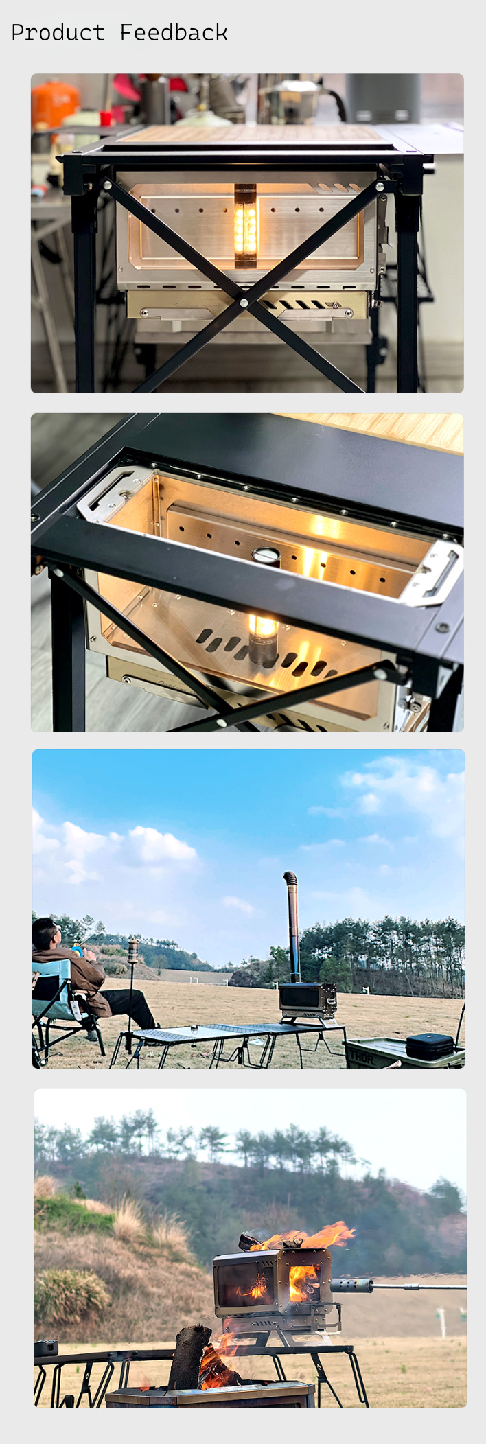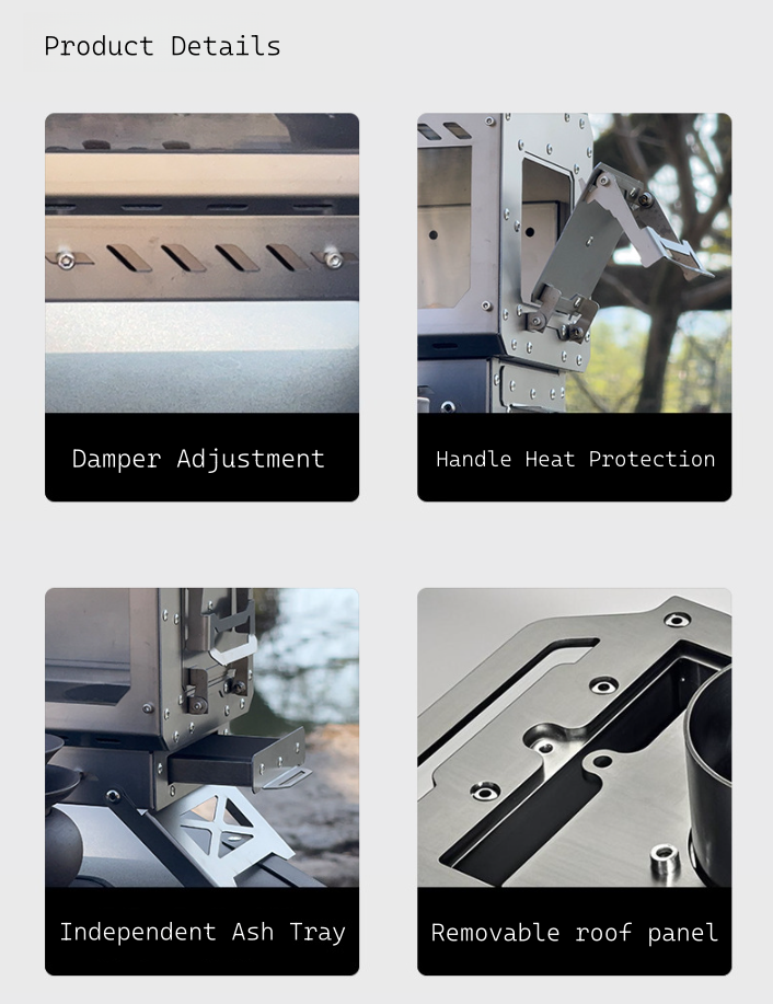 The large insulated glass on the side lets you see the beautiful flames inside, which is very heartwarming. We always bring it along when we go camping.